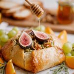 A delicious and elegant baked brie wrapped in flaky puff pastry, topped with fig jam and walnuts, perfect for serving as an appetizer with fruits, crackers, or crostini.