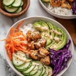 - Assemble the Bowls: Prepare 4 medium-sized serving bowls. In each bowl, add 1 cup of warm white rice, ½ cup of thinly sliced red cabbage, ¼ cup of julienned carrot, and ¼ cup of sliced cucumber. Top each bowl with equal portions of sliced avocado and the sauced Bang Bang chicken.