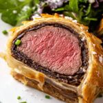 - Serve: Slice the Beef Wellington into thick rounds. Garnish with freshly minced chives and an additional sprinkle of flaky sea salt. Serve immediately.