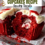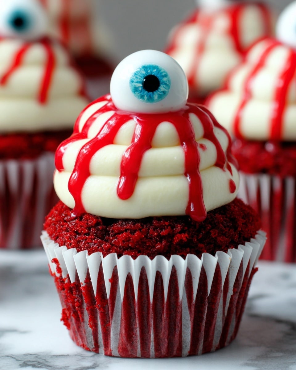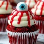 Bloody Eyeball Cupcakes are a spooky and delicious dessert perfect for Halloween or themed parties. These red velvet cupcakes have a surprise cherry filling at the center, topped with creamy cheesecake frosting and decorated with red sparkle gel and eyeball candies for a creepy effect.