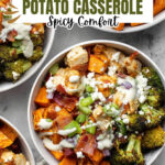 This Buffalo Chicken Sweet Potato Casserole combines tender chicken, roasted sweet potatoes, and broccoli tossed in a spicy buffalo sauce, topped with melted cheddar, green onions, and turkey bacon. Perfect for a flavorful and hearty dinner that balances spice and comfort in one dish.