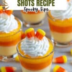 Once your layers are completely firm, finish each shot with a dollop of whipped cream and a couple of candy corn pieces for that iconic look. Pro tip: wait to garnish until right before serving so the whipped cream stays fresh and the candy corn doesn’t get sticky.