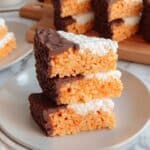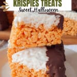 Candy Corn Rice Krispies Treats are a fun and festive twist on the classic treat, combining crispy Rice Krispies cereal with gooey marshmallows, vibrant orange coloring, and dipped in white and mini chocolate chips to resemble candy corn. Perfect for Halloween or any seasonal celebration.