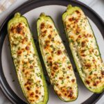 Delicious Feta Cheese Stuffed Zucchini featuring tender zucchini boats filled with a creamy blend of crumbled feta, Greek yogurt, Gruyere cheese, and herbs, baked to golden perfection. Perfect as a light appetizer or side dish.