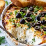 A rich and creamy cheesy baked olive dip featuring a blend of sour cream, cream cheese, mozzarella, Parmesan, and black and green olives. Perfectly seasoned and baked to a golden brown, this savory dip is a crowd-pleaser served warm with sliced French baguette.