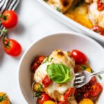 A delicious and easy Chicken Caprese recipe featuring juicy seared chicken breasts topped with melted buffalo mozzarella, sautéed cherry tomatoes, fresh basil, and a drizzle of balsamic vinegar for a fresh Italian-inspired meal.