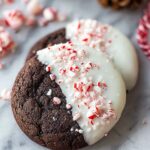 Delight in festive Dark Chocolate Candy Cane Cookies featuring rich cocoa and a peppermint twist, finished with a coating of melted white chocolate and crushed candy canes for a perfect holiday treat.