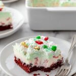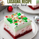 This Christmas Lasagna Dessert is a festive layered treat featuring a red velvet cake base, a creamy peppermint cream cheese layer, and a vibrant green vanilla pudding topping. Garnished with crushed candy canes and holiday sprinkles, it’s perfect for holiday celebrations and serves as a crowd-pleasing dessert.