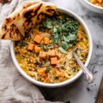 This Coconut Sweet Potato Lentil Soup with Rice is a comforting and flavorful dish featuring tender sweet potatoes, red lentils, and creamy coconut milk infused with yellow curry and fresh spices. Perfect for a wholesome lunch or dinner, it’s served over basmati rice and garnished with fresh cilantro and warm naan bread.