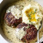 Juicy hamburger steaks cooked to perfection and smothered in a rich, creamy dill sauce, making for a comforting and flavorful main course.