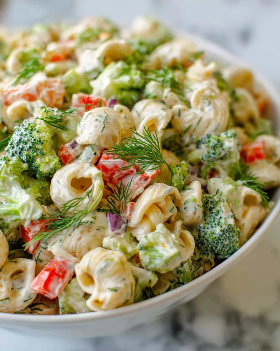 Drain the pasta well and rinse under cold water to stop cooking. Toss the salad lightly with the dressing—not drowning—and store covered in the fridge until serving to keep veggies crisp.