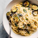 - Toss pasta and zucchini: Add the cooked pasta to a large skillet over medium-low heat. Toss it with the fried zucchini mixture, gradually adding reserved pasta liquid until the sauce becomes creamy and coats the pasta well.
