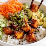 - Serve: Serve the crispy gochujang tofu with rice and fresh vegetables like cucumber, carrot, avocado, and sprinkle with sesame seeds. Also great with steamed broccoli or on its own.