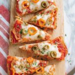 - Add the toppings: Arrange the sliced olives first over the tomato spread, followed by the red bell pepper strips, and then sprinkle the diced mozzarella evenly on top.