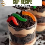 In my experience, freezing the pudding mixture changes its texture, so I don’t recommend freezing completed dirt cups. However, the cookie crumbs and gummy worms freeze well if you want to prep those ahead of time.