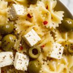 - Combine Ingredients: In a large mixing bowl, add the cooked pasta, chopped green olives, and feta cheese cubes. Pour the dressing over the salad and toss thoroughly to coat all ingredients evenly.