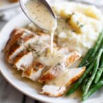 A rich and flavorful turkey gravy made from pan drippings and fresh herbs, perfect for enhancing your holiday meal or any roast turkey dinner.