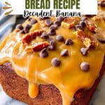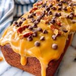 - Assemble and Serve: Pour the peanut butter glaze evenly over the cooled banana bread. Sprinkle the caramelized candied bacon pieces and additional chocolate chips on top for garnish. Slice the loaf and serve immediately for the best flavor and texture.