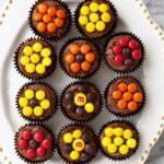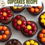 These adorable Fall Daisy Mini Cupcakes feature rich chocolate cupcakes topped with creamy chocolate buttercream and decorated with colorful M&M’s arranged to look like daisies—perfect for festive autumn gatherings or a fun dessert treat.