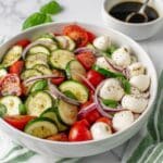 A refreshing and light Fresh Cucumber Caprese Salad featuring diced cucumber, cherry tomatoes, fresh mozzarella, and a flavorful herb marinade with olive oil and balsamic vinegar, perfect as a healthy appetizer or side dish.