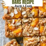Delicious fresh peach bars with a sweet and tangy peach filling layered between a buttery oatmeal crumb base and a crunchy almond streusel topping, perfect for a summery dessert or snack.