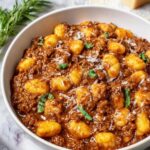 A classic Italian dish featuring tender gnocchi tossed in a rich, flavorful Bolognese sauce made with ground beef, aromatic vegetables, fresh herbs, and Parmesan cheese. Perfect for a comforting family dinner.