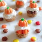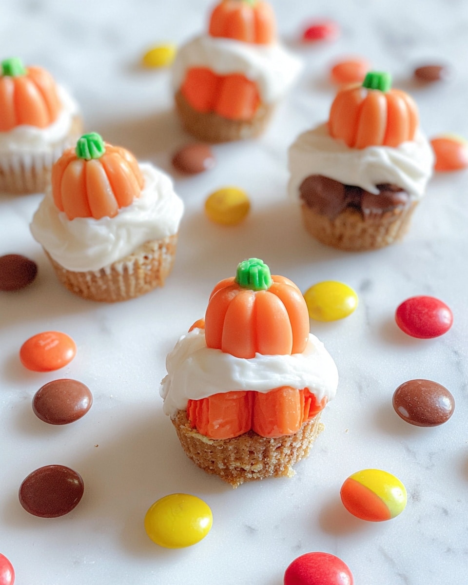 The image shows several small treats arranged on a white marbled surface. Each treat has three layers: the bottom layer is a brown chocolate base, the middle layer is a white creamy topping that looks soft and thick, and the top layer is a small orange pumpkin-shaped candy with a green stem. There are colorful round candies scattered around the treats in red, yellow, and brown shades. The background is blurred but features autumn colors like yellow and orange, with two small pale wooden house shapes placed behind the treats. Photo taken with an iphone --ar 4:5 --v 7