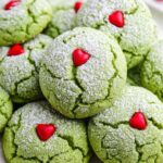 Delightfully festive Grinch Cookies made with white cake mix, peppermint extract, and vibrant green food coloring, coated in powdered sugar for a fun and tender treat perfect for holiday celebrations.