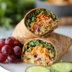 A flavorful BBQ grilled chicken wrap featuring seasoned grilled chicken breasts wrapped in whole wheat tortillas with a mix of creamy Greek yogurt, low sugar BBQ sauce, crunchy coleslaw, fresh cilantro, tomatoes, and shredded cheddar cheese. Perfect for a satisfying and healthy lunch or dinner.