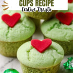 Delightfully festive Grinch Cookies feature green-tinted sugar cookie dough wrapped around a Hershey’s Kiss, baked into mini muffin tins and topped with heart candy sprinkles for a fun holiday treat.