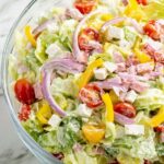 A vibrant and flavorful Grinder Salad featuring a zesty homemade dressing combined with fresh iceberg lettuce, red onion, tomatoes, pepperoncini, provolone cheese, salami, and deli turkey. This quick and easy salad comes together in just 10 minutes, perfect for a satisfying lunch or light dinner.