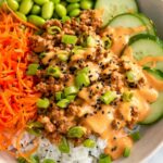 This Ground Turkey Rice Bowls recipe features a flavorful, savory ground turkey mixture cooked with aromatic spices and sesame oil, paired with a creamy, spicy-sweet Bang Bang Sauce. Served over rice with fresh vegetables like shredded carrots, cucumbers, and edamame, this dish is a versatile and satisfying meal perfect for a quick weeknight dinner or meal prep.