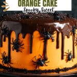 A round cake with two main layers covered in bright orange smooth frosting forms the base. On top, a thick dark chocolate layer is melted, dripping unevenly down the sides, creating a contrast with the orange. The cake is decorated with many small black plastic spiders placed on the sides, dripping chocolate, and the base, giving a spooky Halloween look. It sits on a glossy black surface with a dark background, making the bright colors stand out. Photo taken with an iphone --ar 4:5 --v 7