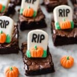 These Halloween Brownies are a festive treat featuring moist chocolate brownies topped with green buttercream frosting, Milano cookie ‘headstones’ decorated with RIP in black gel, and candy pumpkins for a spooky graveyard effect. Perfect for Halloween parties or seasonal desserts.