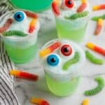 Arrange gummy worms and gummy eyeballs right on top of the sherbet. I find placing them on bigger sherbet chunks helps keep them afloat longer — plus, it makes the presentation look more dramatic! Serve your punch immediately to enjoy that fizzy, creamy magic before the sherbet dissolves too much.