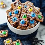 Once these Halloween Pretzel Monster Eyeballs have set, I store leftovers in an airtight container at room temperature. They keep their texture well for about 2 days, but they’re practically gone by then in my house!