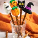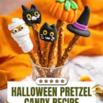 One fun idea I’ve tried is sticking the decorated pretzels upright in a pumpkin-shaped foam block (covered with Halloween-themed tissue) to create a “pretzel bouquet” centerpiece. You could also line them up on a decorative platter with alternating chocolate colors or nestle them into mini cauldrons for some Halloween magic.