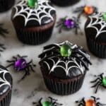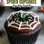 Spooky and fun Halloween Spider Cupcakes featuring chocolate cupcakes with black frosting, white spiderweb designs, and topped with toy spider rings—perfect for a festive party treat.