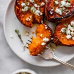 - Transfer and Garnish: Move the roasted sweet potato rounds to a serving platter. Season with additional salt if desired. Drizzle more honey over the top and sprinkle the crumbled feta cheese evenly. Garnish with freshly chopped chives or parsley for a fresh finish.