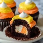 Fit each colored frosting into separate piping bags, then pipe in a circular motion on your cupcakes starting with yellow, followed by orange, and finishing with white on top. The result looks like candy corn, adding a whimsical touch perfect for St. Patrick’s or any party!