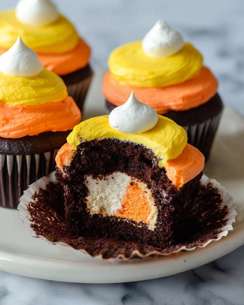 - Decorate Cupcakes: Fill piping bags with each color and pipe the frosting onto the cupcakes in a circular motion, layering yellow first, then orange, and topping with white to achieve a candy corn effect.