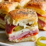 These Hot Italian Sub Sliders are a delicious and easy-to-make appetizer or snack featuring a combination of ham, salami, pepperoni, provolone cheese, and tangy peppers, all baked on soft Hawaiian rolls and brushed with garlic Italian butter for extra flavor. Perfect for parties or game day gatherings.