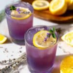 Two clear glasses filled with a purple drink with a smooth surface are placed on a white marbled texture. Each glass has a yellow lemon slice floating on top and is garnished with a small sprig of green leaves and a tiny purple flower, all placed near the lemon slice. In the background, there are lemon wedges and some loose lavender buds scattered around, and a curved wooden tray adds a warm tone to the scene. The image has bright natural light and soft shadows. photo taken with an iphone --ar 4:5 --v 7
