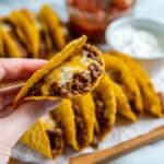 6. Fold Tacos: Remove the trays from the oven and immediately, while the cheese is still warm and pliable, gently fold each mini taco together to form a taco shape without breaking the chip.