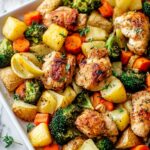 A flavorful and easy Sheet Pan Lemon Herb Chicken and Vegetables recipe featuring juicy marinated chicken breast pieces roasted alongside tender baby carrots, golden potatoes, and broccoli florets. Perfect for a wholesome and fuss-free dinner with bright lemon and herb seasonings.