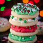 This Lofthouse Cookies recipe offers soft, fluffy sugar cookies topped with a creamy, smooth frosting. Perfectly sweet and mildly flavored with vanilla and almond extracts, these classic cookies are easy to make and fun to decorate with sprinkles and food coloring.