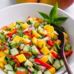 A refreshing and vibrant Mango Salad made with ripe mangoes, bell pepper, cucumber, red onion, and fresh basil. Tossed in a tangy and slightly sweet homemade dressing with lemon juice, honey, avocado oil, fresh ginger, and a hint of chili flakes, this salad is perfect for a light lunch or as a side dish.