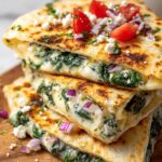 Delicious Mediterranean quesadillas filled with fresh spinach, tangy feta, melted mozzarella, and crisp red onion, perfect for a quick and flavorful meal.