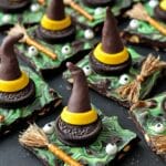 6. Assemble Decorations: Place the cookie witch hats evenly over the chocolate bark. Distribute the witch brooms evenly throughout the bark. Scatter the candy eyeballs on top for a creepy touch.
