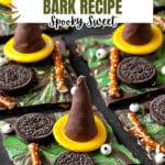 A spooky and delicious Halloween treat combining chocolate witch hats, brooms, and colorful melted chocolate bark with candy decorations. Perfect for festive parties and easy to make with simple ingredients and fun decorative touches.